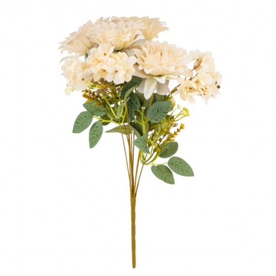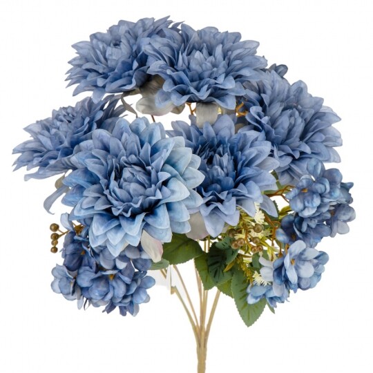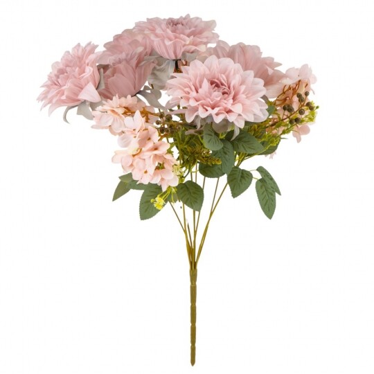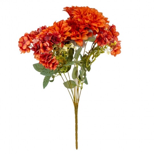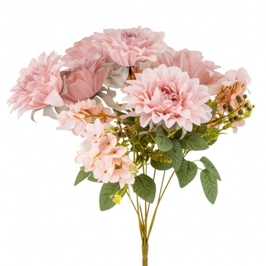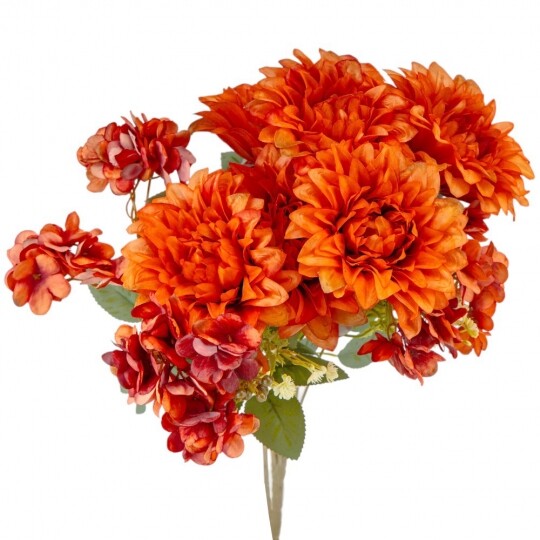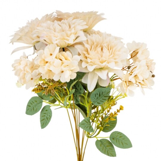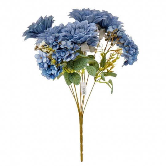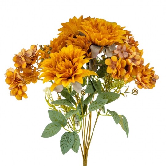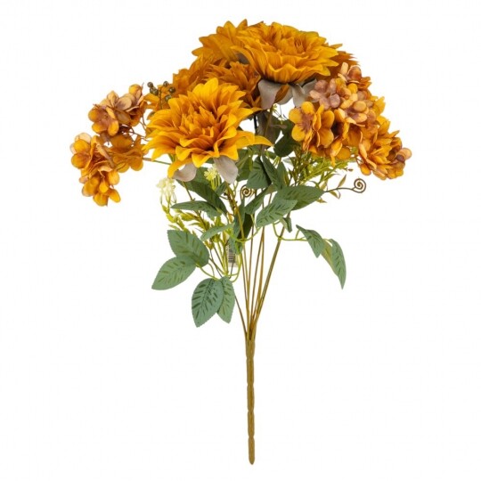 Висота – 45 см, ширина букету - 27 см. Діаметр бутону - 12 см. В букеті 6 жоржин та 3 суцвіття гортензій. Квіти виконані з тканини, стебла - з пластику. Штучний букет із жоржин та гортензій створює враження природної пишності та гармонійної композиції. Великі об’ємні бутони жоржин поєднуються з ніжними суцвіттями гортензій, додаючи букету текстурної глибини. Декоративна зелень і дрібні акценти надають завершеного вигляду, роблячи його чудовим вибором для декору інтер’єру чи святкових подій.