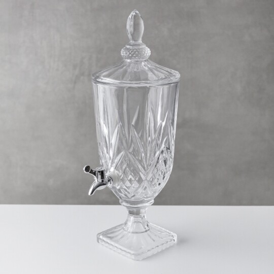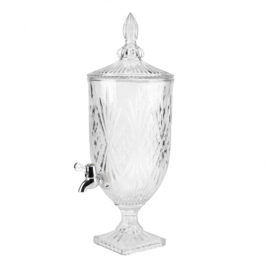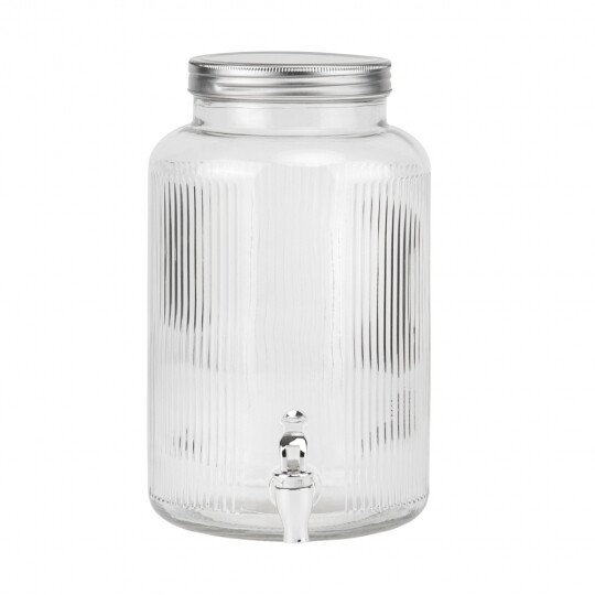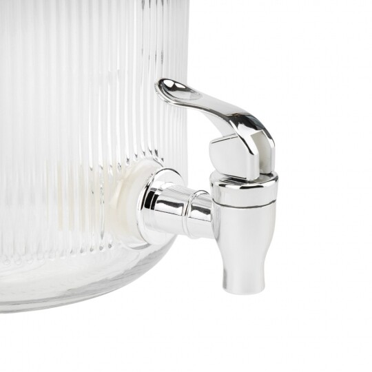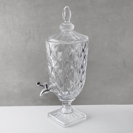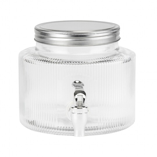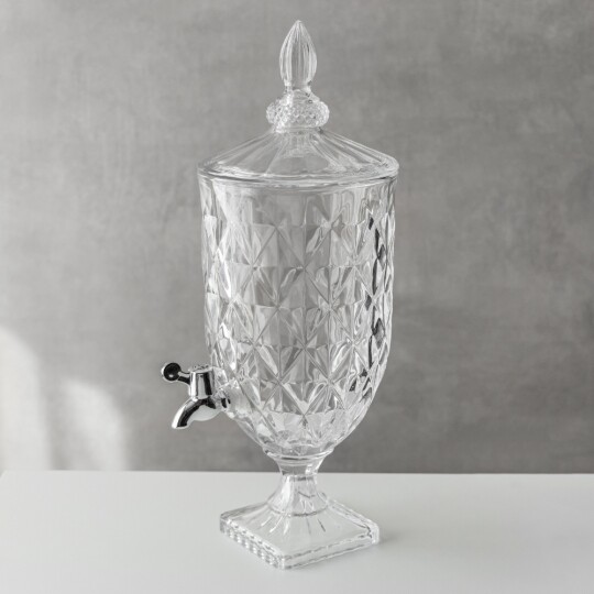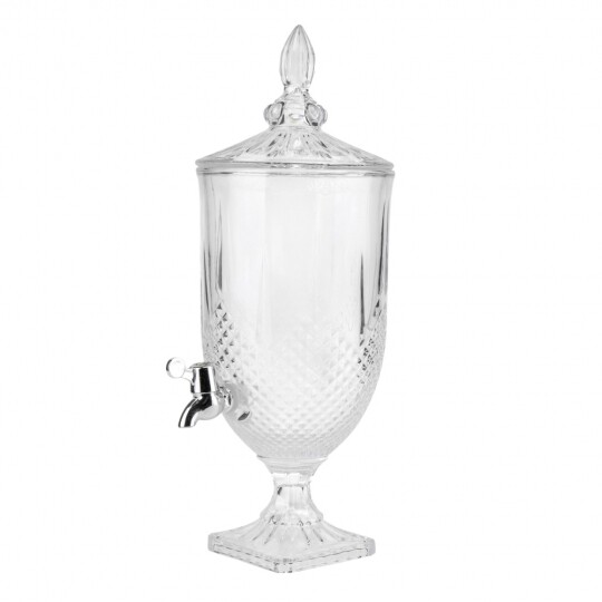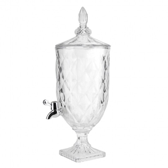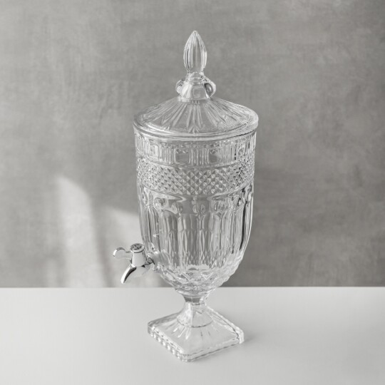 Висота з кришкою - 52 см, без кришки - 37,5 см, діаметр - 19 см. Довжина крана - 6 см, підставки - 12 см. Запакована в подарункову коробку. Скляна лимонадниця об'ємом 5 літрів стане елегантним акцентом на будь-якому столі, поєднуючи витончений дизайн і функціональність. Завдяки рельєфному візерунку вона має стильний вигляд, а щільна кришка допомагає зберегти свіжість напоїв. Вбудований краник забезпечує зручне наливання без розливання, що робить її ідеальним вибором для лимонадів, компотів, холодного чаю та інших освіжаючих напоїв. Підходить для домашнього використання, святкових подій і фуршетів, додаючи естетики та комфорту в сервірування напоїв.