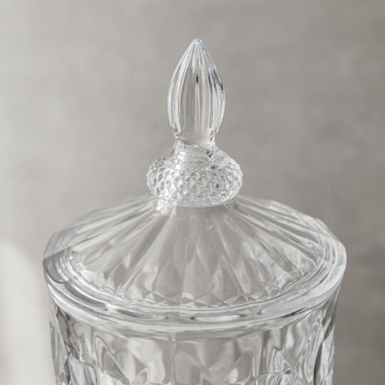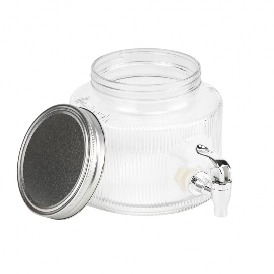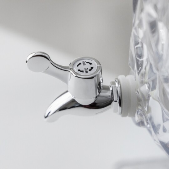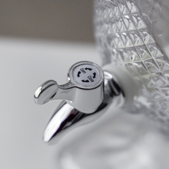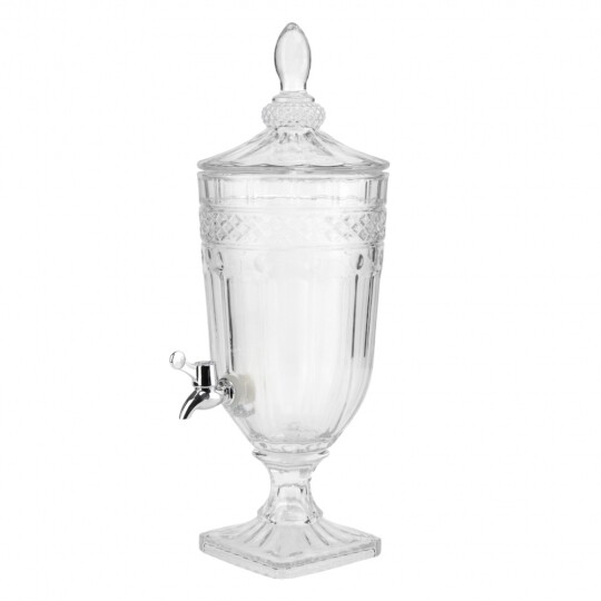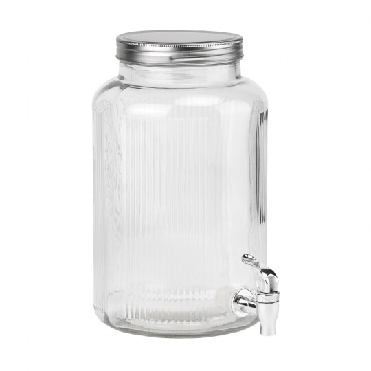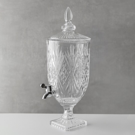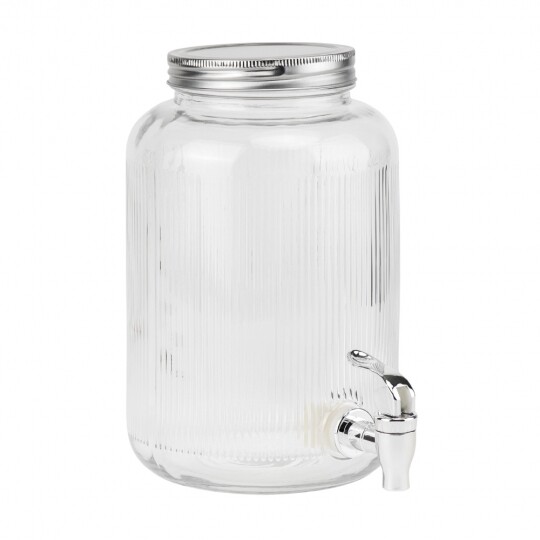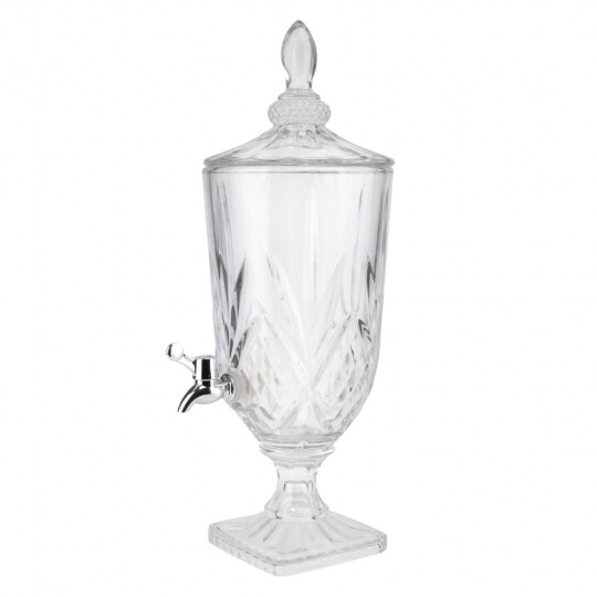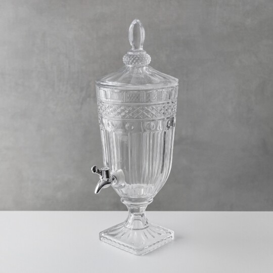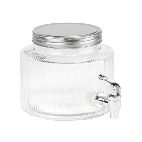 Висота з кришкою - 52 см, без кришки - 37,5 см, діаметр - 19 см. Довжина крана - 6 см, підставки - 12 см. Запакована в подарункову коробку. Скляна лимонадниця об'ємом 5 літрів стане елегантним акцентом на будь-якому столі, поєднуючи витончений дизайн і функціональність. Завдяки рельєфному візерунку вона має стильний вигляд, а щільна кришка допомагає зберегти свіжість напоїв. Вбудований краник забезпечує зручне наливання без розливання, що робить її ідеальним вибором для лимонадів, компотів, холодного чаю та інших освіжаючих напоїв. Підходить для домашнього використання, святкових подій і фуршетів, додаючи естетики та комфорту в сервірування напоїв.