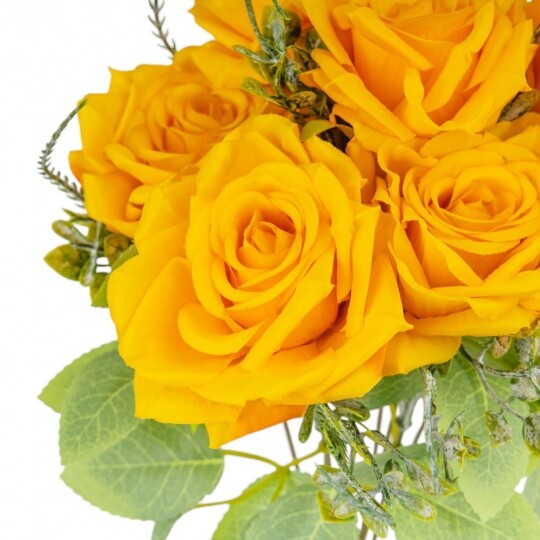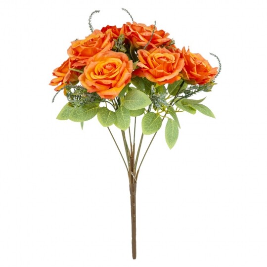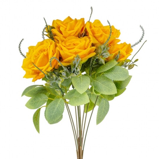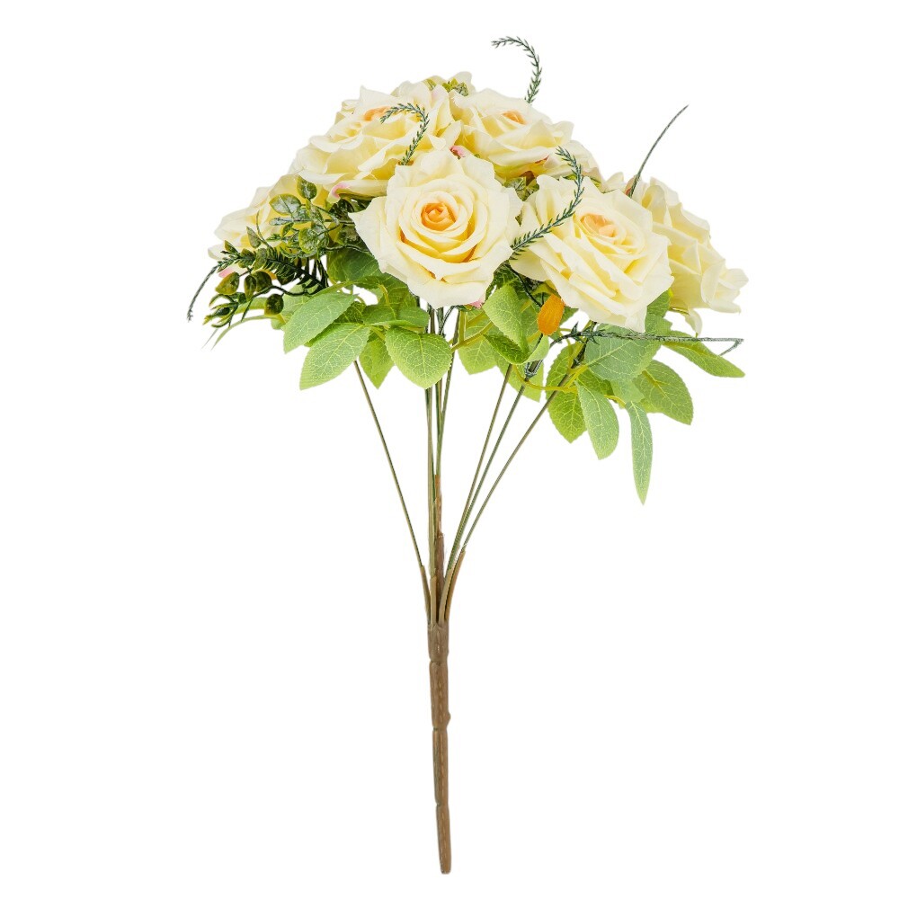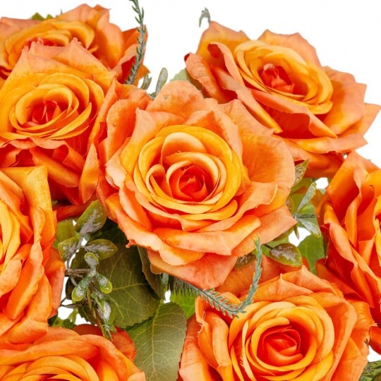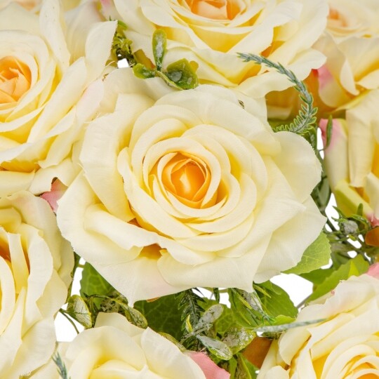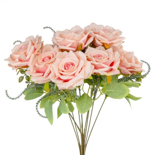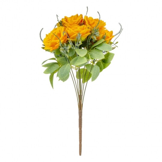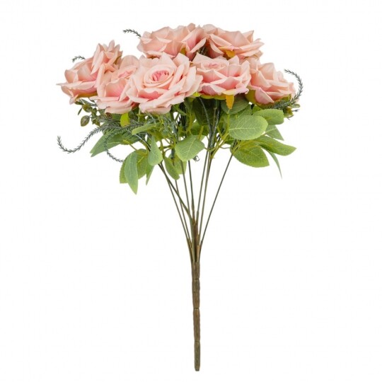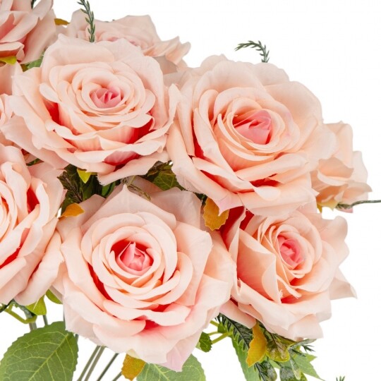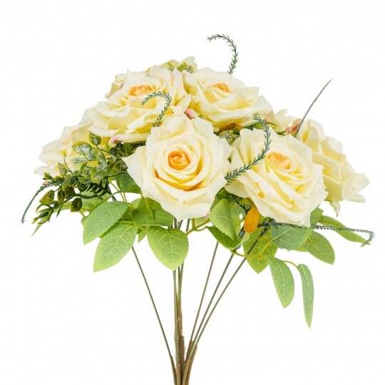 Висота – 40 см, ширина букету - 25 см. Діаметр бутону - 8 см. В букеті 9 троянд. Квіти виконані з тканини, стебла - з пластику. Вишуканий штучний букет троянд із реалістичними пелюстками та декоративною зеленню виглядає природно та елегантно. Ідеальний для оформлення інтер’єру, створення святкової атмосфери або стильної фотозони. Довговічні матеріали гарантують збереження бездоганного вигляду без спеціального догляду.