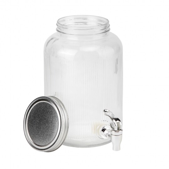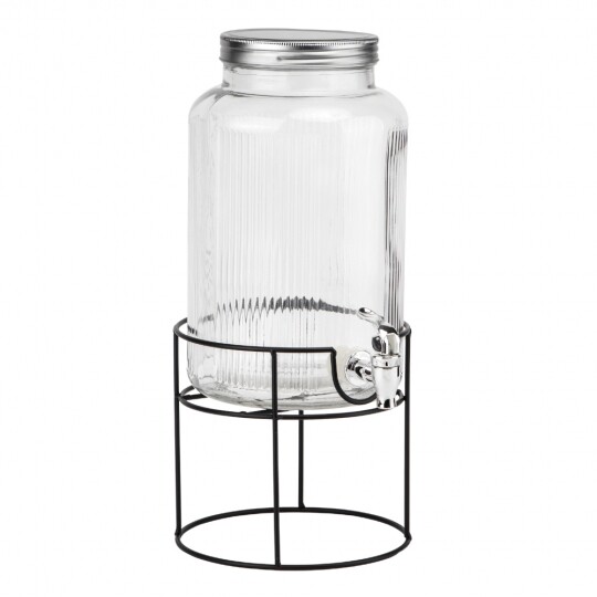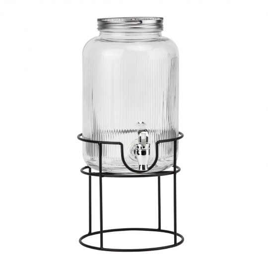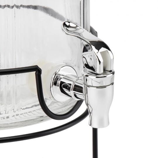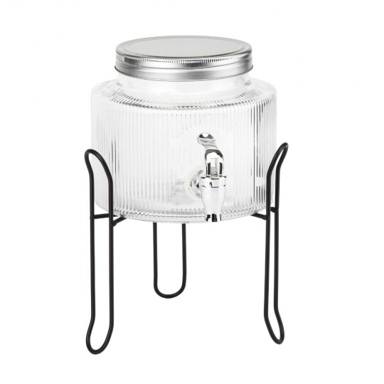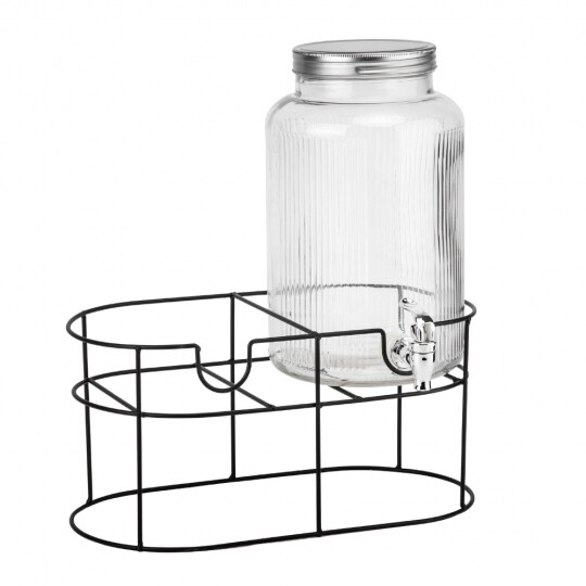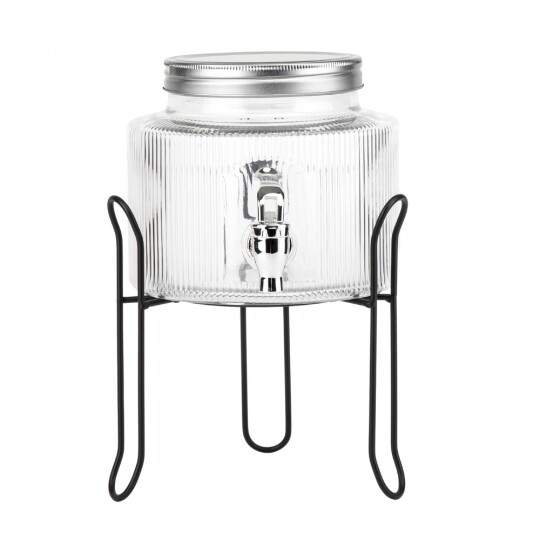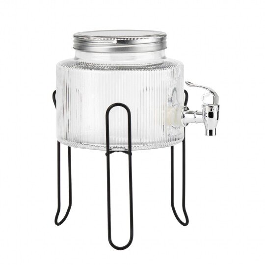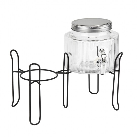 Об'єм - 5,5 л. Висота набору - 47,5 см. Висота лимонадниці - 29,5 см, діаметр - 17,5 см. Діаметр кришки - 13 см. Висота підставки - 18 см, діаметр - 19 см. Довжина крана - 6 см. Набір запакований в подарункову коробку. Скляна лимонадниця з кришкою на металевій підставці — це стильний і практичний диспенсер для напоїв, який ідеально підходить для подачі лимонаду, соку, холодного чаю чи води. Завдяки рифленому склу вона має елегантний вигляд, а герметична металева кришка забезпечує збереження свіжості напоїв. Вбудований краник дозволяє легко наливати напій без необхідності нахиляти ємність, що робить її зручною у використанні. Металева підставка додає стійкості та естетики, роблячи цю лимонадницю чудовим доповненням до сервірування на вечірках, весіллях або просто для щоденного використання