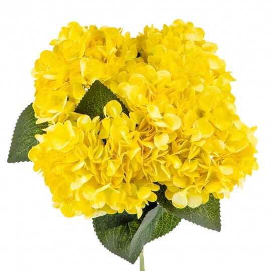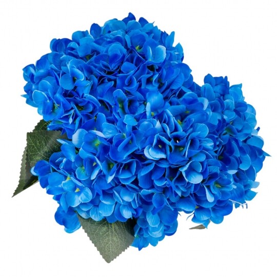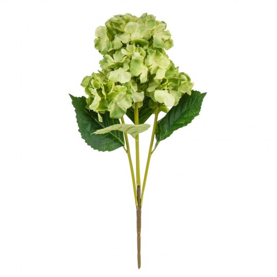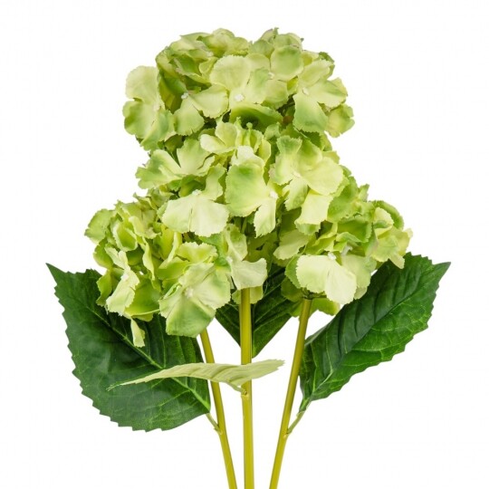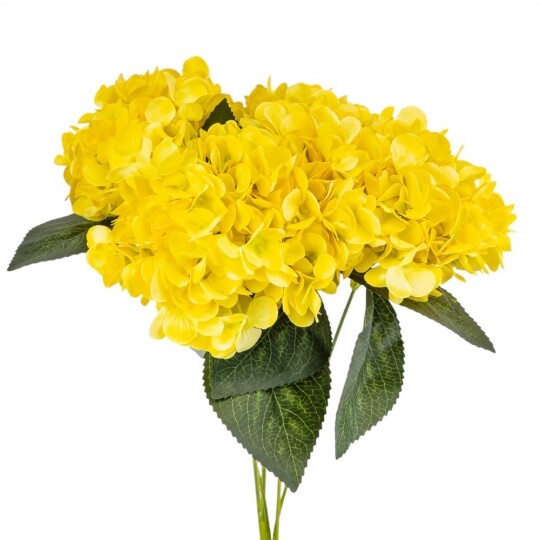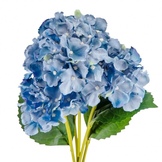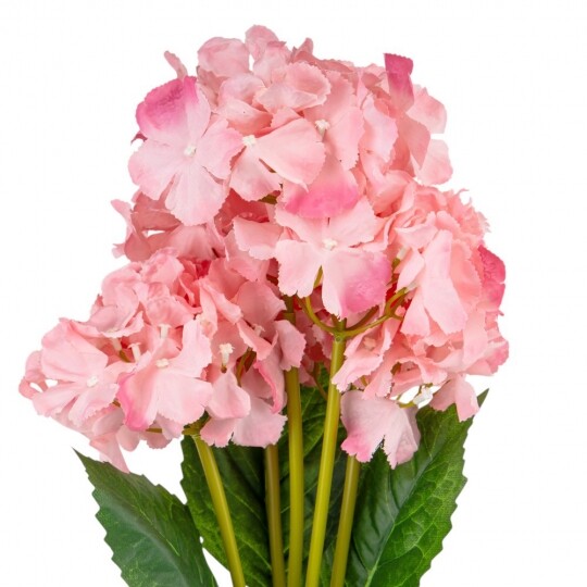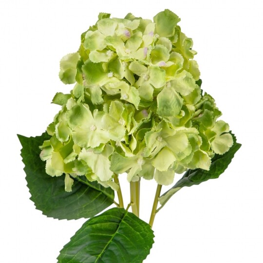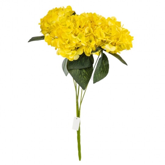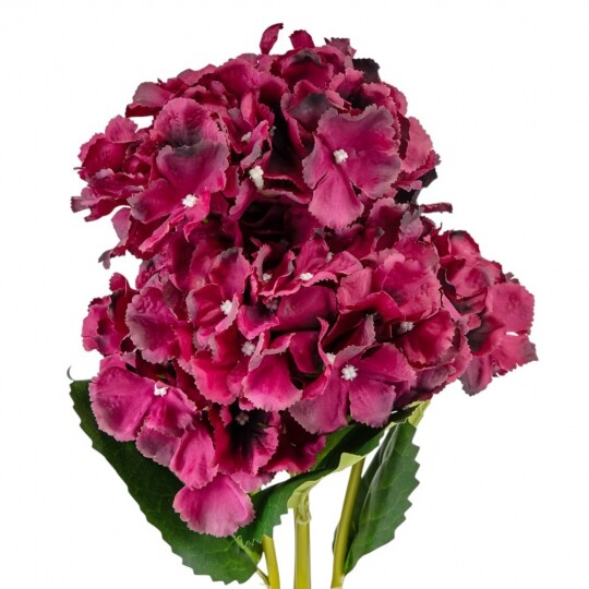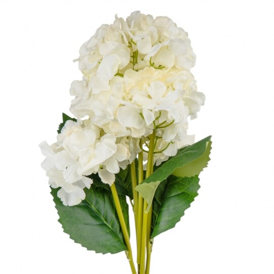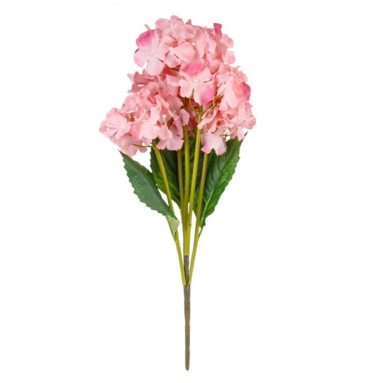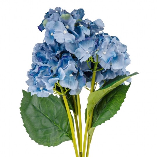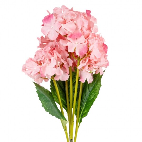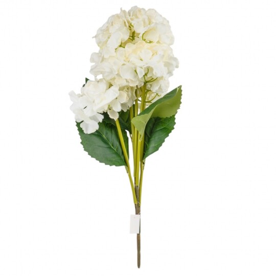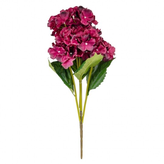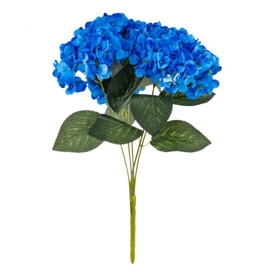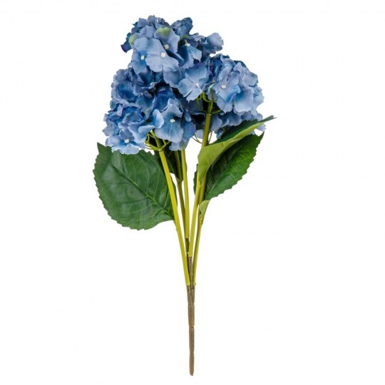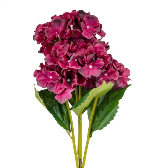 Висота – 52 см, ширина букету - 22 см. Діаметр бутону - 13 см. В букеті 5 бутонів. Квіти виконані з тканини, стебла - з пластику. Штучний букет гортензій з об’ємними суцвіттями виглядає природно та витончено. Декоративне листя додає композиції натуральності, роблячи її ідеальним вибором для інтер’єру або святкового оформлення. Завдяки якісним матеріалам квіти не втрачають форму та вигляд, не потребуючи догляду.