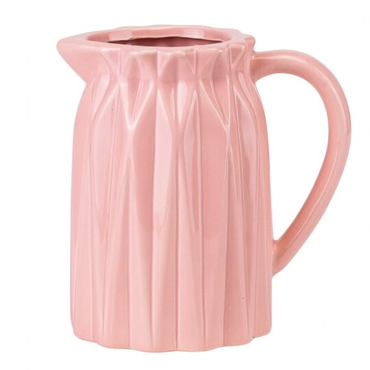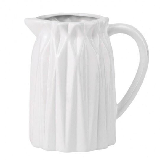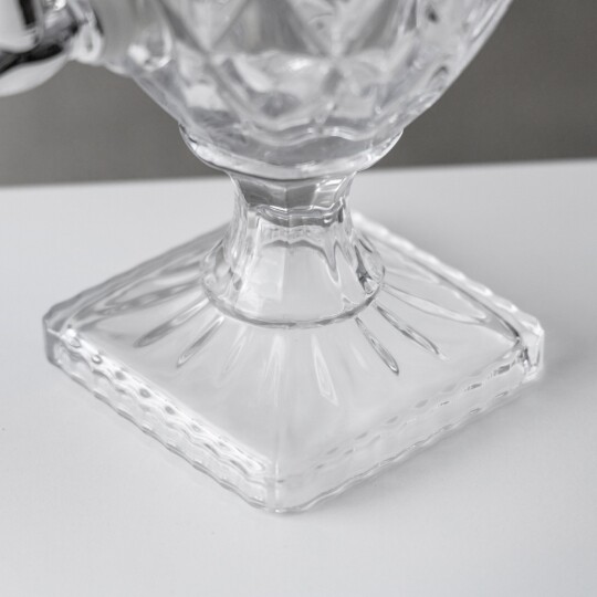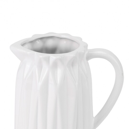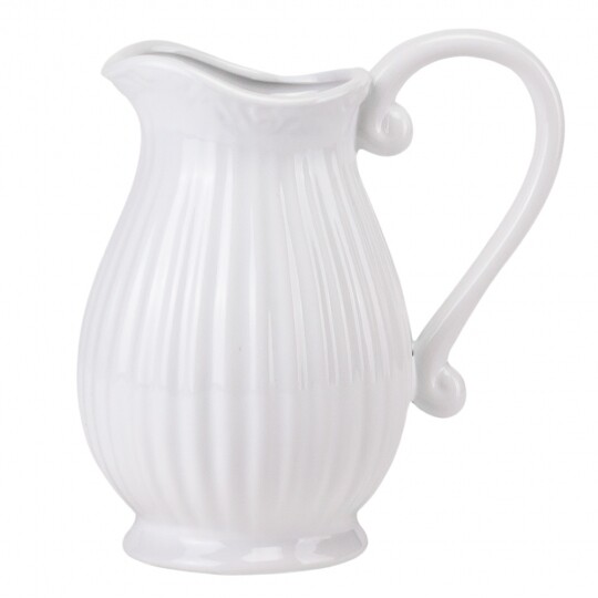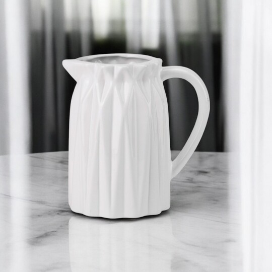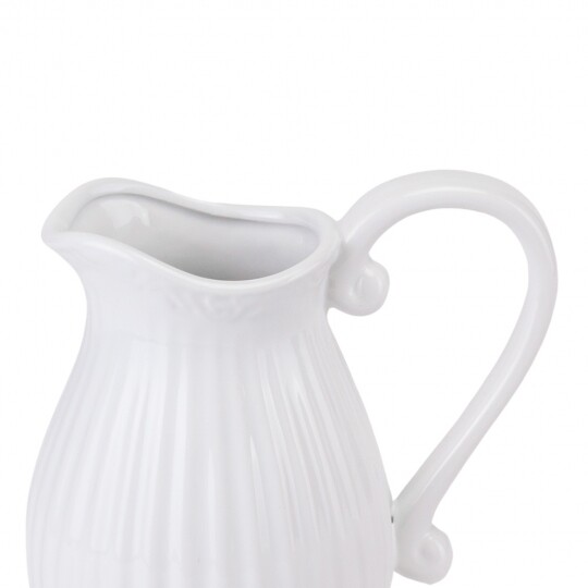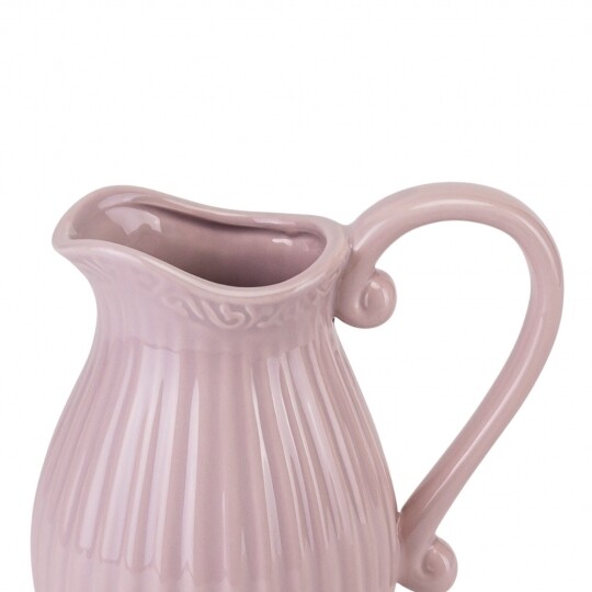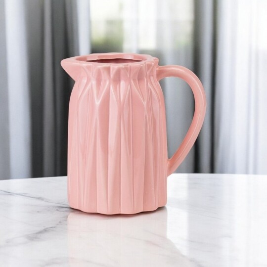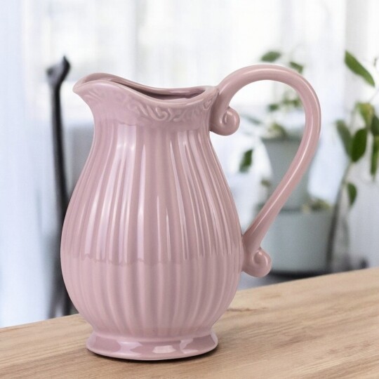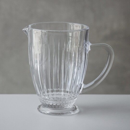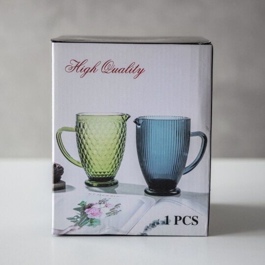 Об'єм - 1,2 л. Висота – 19 см, діаметр – 13 см, довжина з ручкою - 20 см. Витончений скляний глечик із рельєфним вертикальним візерунком, що надає йому елегантності та класичного вигляду. Завдяки широкій основі він стійкий, а зручна ручка забезпечує комфортне використання. Носик для наливання дозволяє легко розливати напої без розбризкування. Ідеальний для сервірування води, соків, лимонаду чи інших улюблених напоїв, додаючи естетики будь-якому столу.
