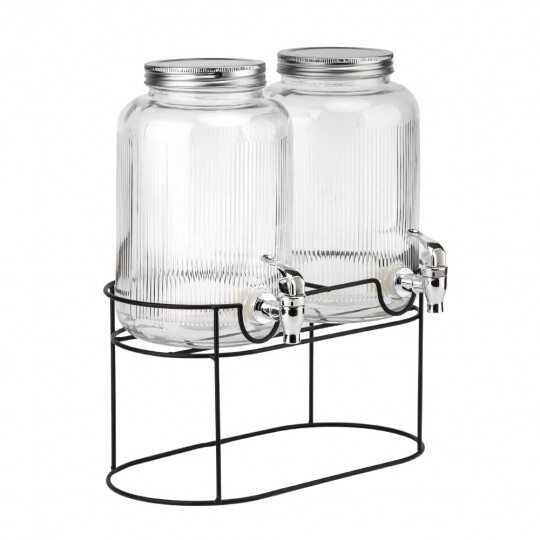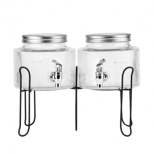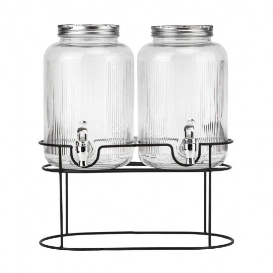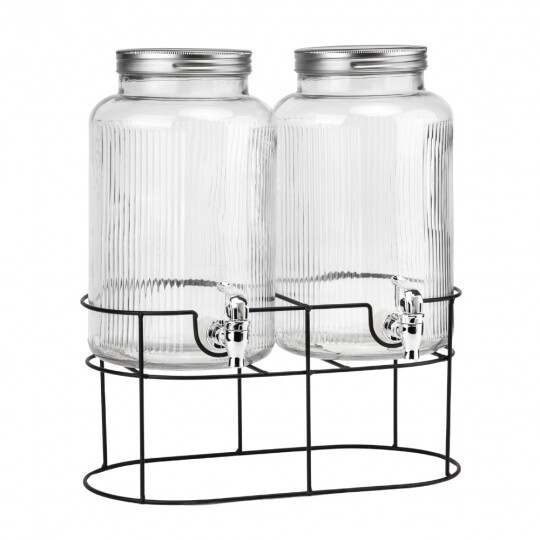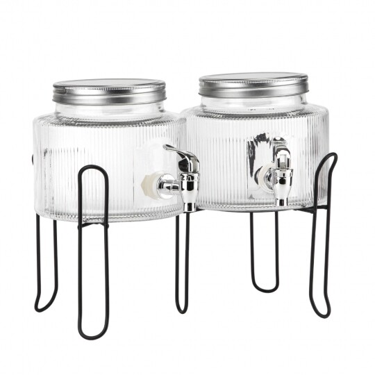 Об'єм - 5,5 л. Висота набору - 47,5 см. Висота лимонадниць - 29,5 см, діаметр - 17,5 см. Діаметр кришки - 13 см. Висота підставки - 18 см, довжина - 35 см, ширина - 19,5 см. Довжина крана - 6 см. Набір запакований в подарункову коробку. Набір із двох скляних лимонадниць на металевій підставці — це стильне та функціональне рішення для подачі напоїв на вечірках, бенкетах чи домашніх заходах. Дві окремі ємності дозволяють одночасно сервірувати різні напої, а краники забезпечують зручне наливання без розливів. Рифлене скло надає виробу елегантності, а герметичні металеві кришки зберігають свіжість напоїв. Металева підставка додає стійкості та естетики, роблячи набір не лише практичним, а й ефектним елементом сервірування.