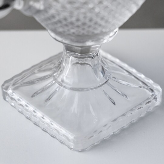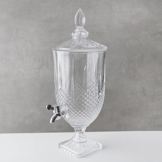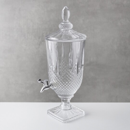 Висота з кришкою - 47 см, без кришки - 34 см, діаметр - 17 см. Довжина крана - 6 см, підставки - 12 см. Запакована в подарункову коробку. Скляна лимонадниця об'ємом 3 літри стане елегантним акцентом на будь-якому столі, поєднуючи витончений дизайн і функціональність. Завдяки рельєфному візерунку вона має стильний вигляд, а щільна кришка допомагає зберегти свіжість напоїв. Вбудований краник забезпечує зручне наливання без розливання, що робить її ідеальним вибором для лимонадів, компотів, холодного чаю та інших освіжаючих напоїв. Підходить для домашнього використання, святкових подій і фуршетів, додаючи естетики та комфорту в сервірування напоїв.