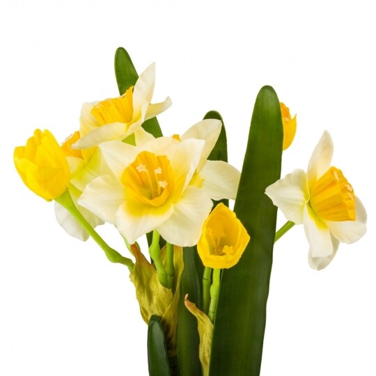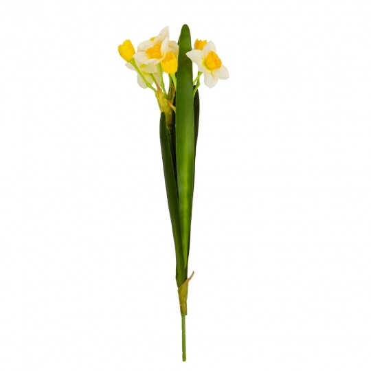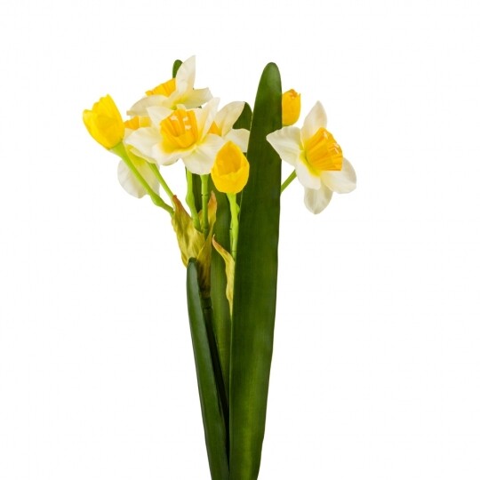 Висота букету – 56 см, діаметр квітів – 6,5 см, довжина бутонів – 4 см. Матеріал – пластик та тканина. Букет нарцисів - витончена композиція, що вражає своєю неповторною красою та реалістичністю, відтворюючи живі квіти з великою деталізацією. Такий букет є ідеальним варіантом для створення декоративних композицій, декорування святкових заходів, фотостудій, вітрин магазинів, кафе тощо! Букет залишиться свіжим та привабливим протягом тривалого часу без надмірного догляду.